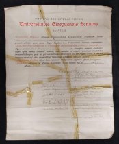 A diploma of medicine from the University of Glasgow for Alice Moorhouse, dated 23 July 1901. The certificate, in poor condition, is printed in latin.