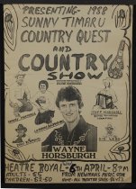 A poster for the 1988 "Sunny Timaru country quest and country show", held at the Theatre Royal, Timaru, 6 April 1988.
