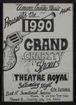 A poster for the Timaru Country Music Association's grand charity show, held at the Theatre Royal, Timaru, on 6 October 1990. Notes proceeds were intended for "Country way F.M. Radio".