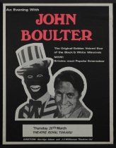 A poster for the show "An evening with John Boulter", held at the Theatre Royal, Timaru, on Thursday 28 March 1974 Boulter was best known for his role appearing on the BBC's show "The Black and White Minstrel Show", which ran form 1958 to 1978. Directed by Kerridge Odeon and J C Williamson Theatres Ltd.