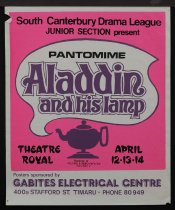 The poster for the Junior Section of the South Canterbury Drama League's presentation of the pantomime of "Aladdin and his lamp". Held at the Theatre Royal, Timaru, from 12-14 April 1984. Bookings were available form the "Record & Video Parlour". Posters sponsored by Gabites Electrical Centre. Two copies held.